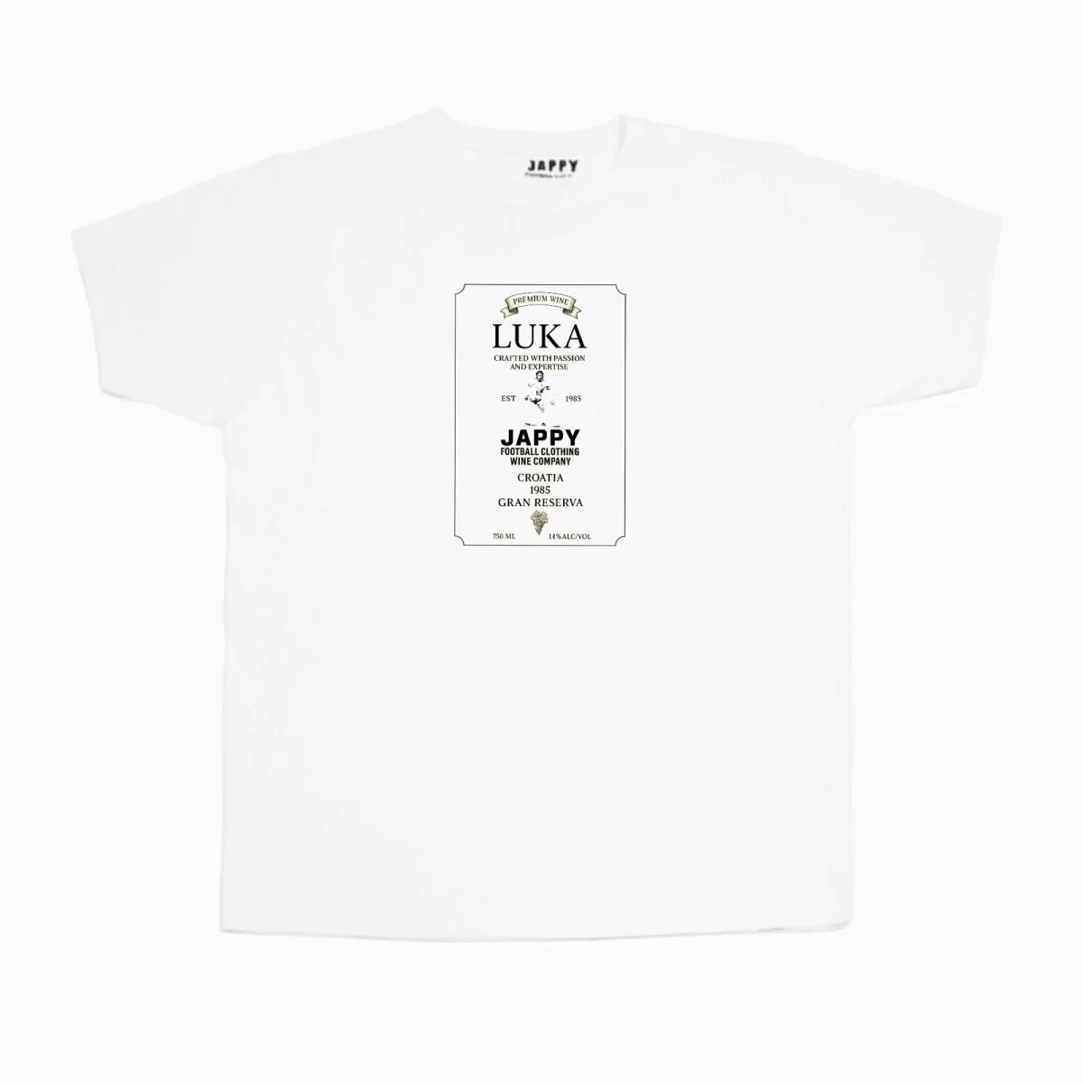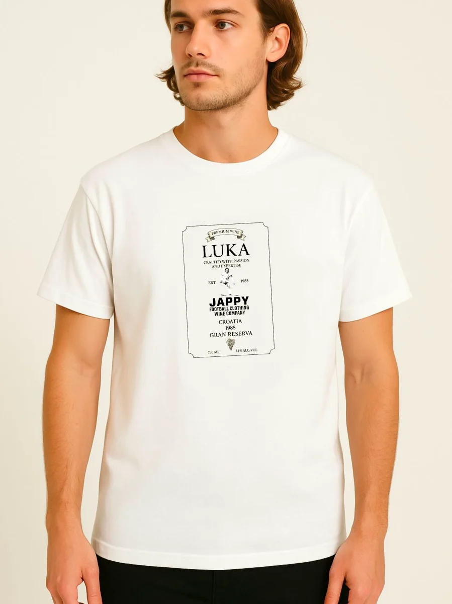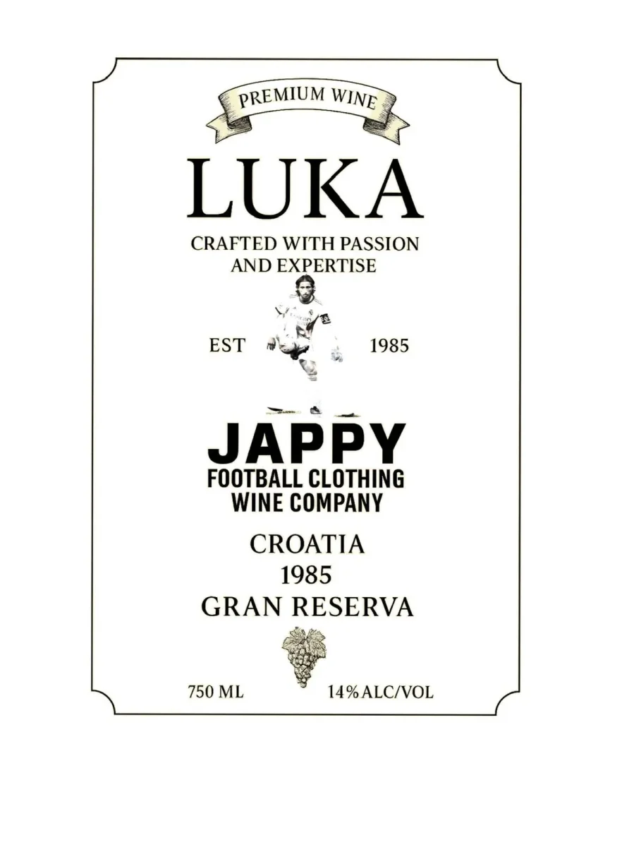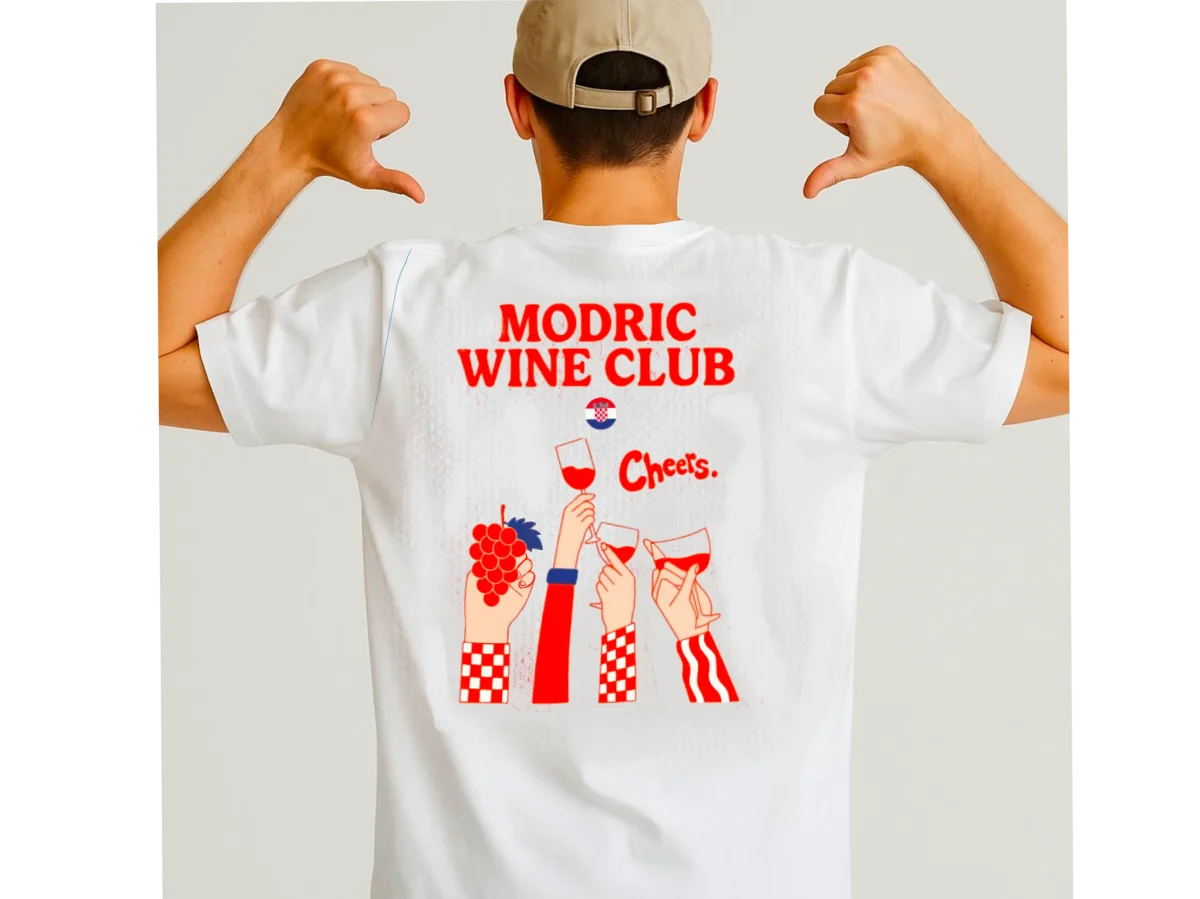 En el pecho, la etiqueta de un vino imaginario de Croacia, cosecha 1985, convertida en símbolo de clase y carácter. En la espalda, el brindis del Modric Wine Club —un guiño a todos los que entienden que el buen fútbol, como el buen vino, se saborea mejor con el tiempo.