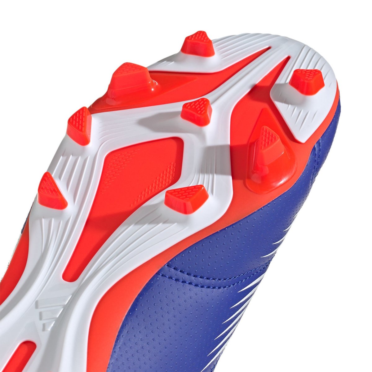La suela FxG incorpora una placa polivalente de tacos triangulares y una distribución 8+4, proporcionando un agarre y equilibrio óptimos en una variedad de terrenos, tanto en hierba natural seca como en césped artificial.