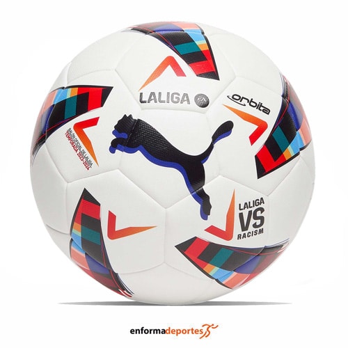 Baloón futbol PUMA ORBITA LA LIGA 1, fabricado con configuración de 32 paneles para un vuelo recto y consistente. Exterior texturizado de PU de 0,4 mm que mejora el aerodinamismo. Capa de espuma de TPE de 3 mm que mejora rebote y aumenta la potencia. Cámara de goma con válvula PUMA Air Lock que mejora la retención del aire y el rebote.