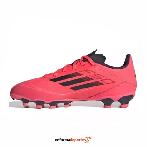 Bota de fútbol junior ADIDAS F50 LEAGUE MG, fabricada en su parte superior sintética que permite movimientos rápidos y un control preciso del balón, con sistema de cierre con cordones, para un mejor ajuste, fabricada en materiales resistentes que soportan el desgaste en superficies artificiales, forro interior acolchado que proporciona confort y suela que proporciona un agarre firme en superficies, proporcionando estabilidad y maniobrabilidad.