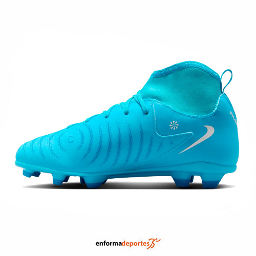 Bota de futbol junior NIKE PHANTOM LUNA 2 CLUB LITTLE, fabricada en su parte superior de piel sintética con calcetín para mayor ajuste, con suela de TPU de una sola pieza, donde incorpora tacos cilíndricos perforados que ofrecen una perfecta tracción y rotación en césped artificial, con tacos cónicos y en forma de arista de 3 puntas redondeadas, se combinan entre sí en una placa en la que encontramos un puente estabilizador en forma de X en la zona central.