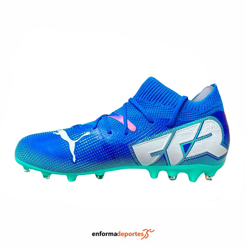 Bota de Fútbol junior PUMA FUTURE 7 MATCH MG, con un diseño moderno y tecnología avanzada, ofrecen una combinación perfecta de estilo y rendimiento, de peso ligero que facilita movimientos rápidos y ágiles en el campo, con cierre con cordones para un ajuste seguro y personalizado y suela Multi-Ground (MG) diseñada para un agarre excelente en múltiples superficies, ideal para terrenos duros y césped artificial.