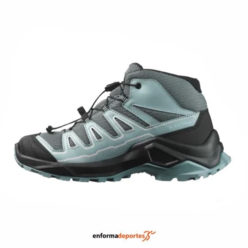 Bota junior SALOMON X ULTRA MID GTX, fabricadas en su parte superior de malla antipartículas, malla ceñida que evita la entrada de material, con material hidrófugo, prtección contra clima, con membrana Gore-Tex. Con pala SensiFit™ que envuelve el pie desde la entresuela hasta el sistema de cordones, lo que proporciona un ajuste seguro, cómodo y prácticamente personalizable alrededor de todo el sistema, puntera protectora, sistema de cierre con cordones QuickLace y suela All Terrain Contagrip®, diseñado para la más amplia variedad de superficies. Ofrece durabilidad y confianza sobre superficies húmedas, secas, duras o resbaladizas.