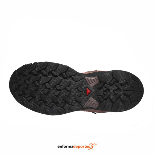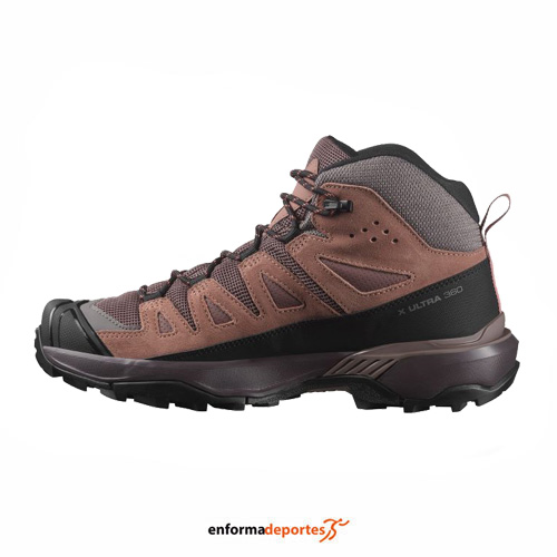Bota mujer SALOMON X ULTRA 360 LTR MID GTX, fabricada en su parte exterior de piel, cuero natural, con cierre con tecnología Quicklace, impermeable gracias a tecnología Gore-Tex, con media suela EnergyCell, amortiguación y comodidad, de altura media, para mayor protección en el tobillo, suela All Terrain Contagrip que garantiza tracción en cualquier tipo de superficie.