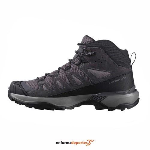 Bota mujer SALOMON X ULTRA 360 LTR MID GTX, fabricada en su parte exterior de piel, cuero natural, con cierre con tecnología Quicklace, impermeable gracias a tecnología Gore-Tex, con media suela EnergyCell, amortiguación y comodidad, de altura media, para mayor protección en el tobillo, suela All Terrain Contagrip que garantiza tracción en cualquier tipo de superficie.