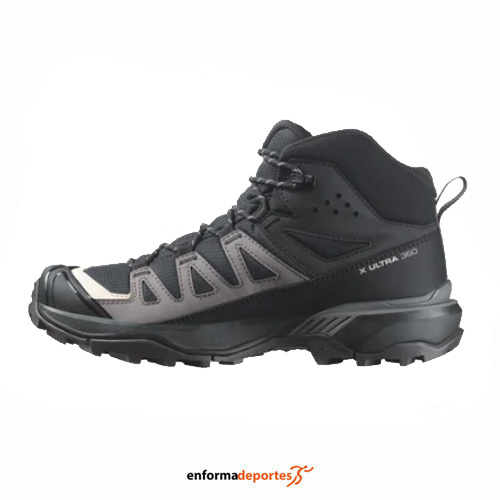 Bota mujer SALOMON X ULTRA 360 MID GTX, fabricadas con membrana Gore-Tex, que garantiza resistencia al agua, máxima impermeabilidad pero a la vez permite la transpiración del pie, con amortiguación moderada con entresuela EnergyCell, construcción de la pala SensiFit, máxima protección al ser de media caña, y suela con tecnología contagrip All-Terrain, durabilidad y tracción en cualquier superficie, con drop: 10 mm