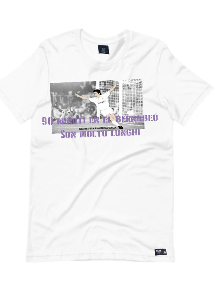 Camiseta de algodón 100% con diseño exclusivo en tributo a uno de los jugadores más icónicos de la historia del Real Madrid , Juan Gómez, y su famosa frase » 90 minuti en el Bernabeu son molto longi», en referencia a las remontadas europeas que disfrutó la afición merengue en el Santuago Bernabeú en los años 90. Todos nuestros artículos se fabrican en Europa con altos controles de calidad y cuidado, utilizando sólo telas exclusivas para recrear las prendas retro de los jugadores más icónicos de la historia del fútbol y poder ofrecer productos con un 100% de nostalgia y un 100% calidad. Todos los artículos de Jappy Football se empaquetan y envían en cajas de regalo. El eñ va de este producto puede demorarse en enviarse entre 3 y 7 dias desde que se realiza el pedido, por motivos logísticos
