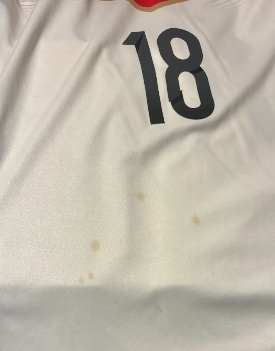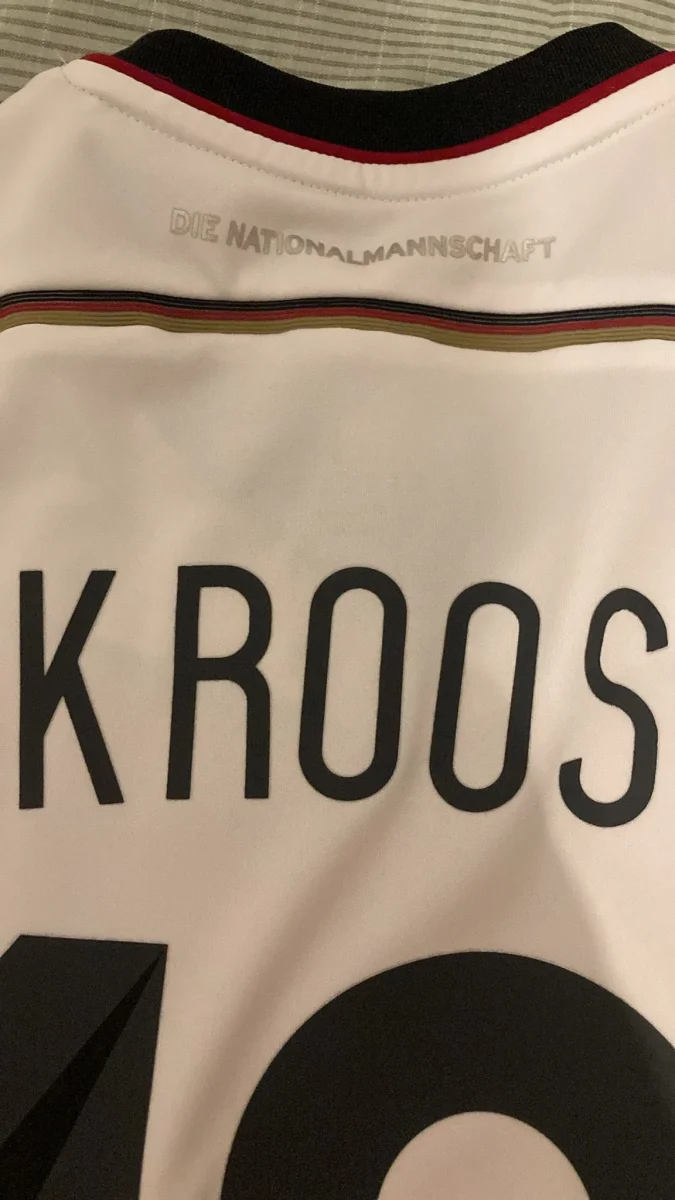 Camiseta auténtica de la primera equipación de la selección alemana de fútbol en talla S en buen estados, pero rebajada por una pequeña mancha en la parte frontal de la camiseta visibles en las fotos y con dorsal 18 del mítico centrocampista alemán Toni Kross.