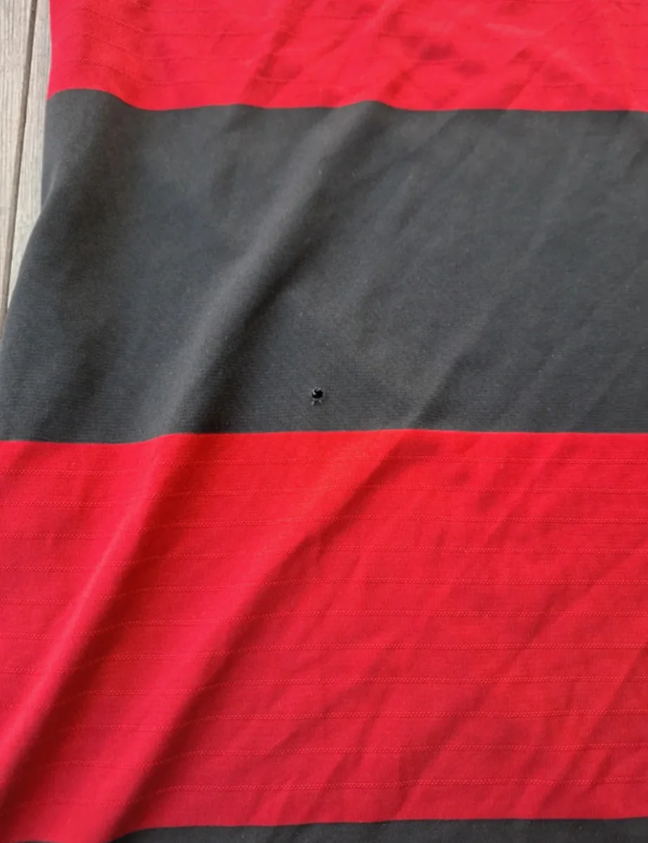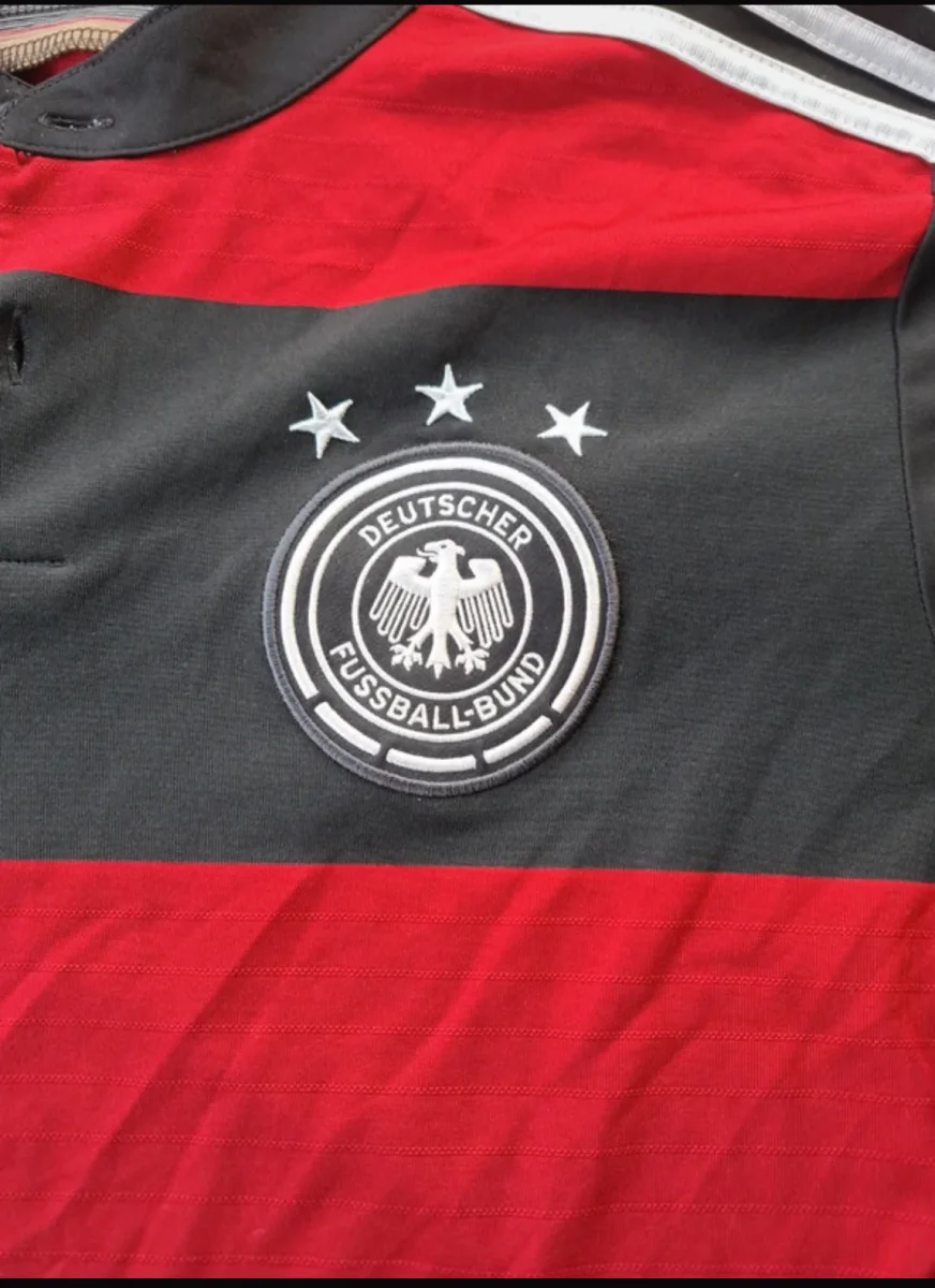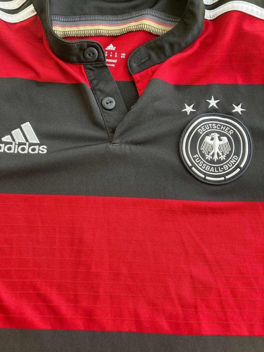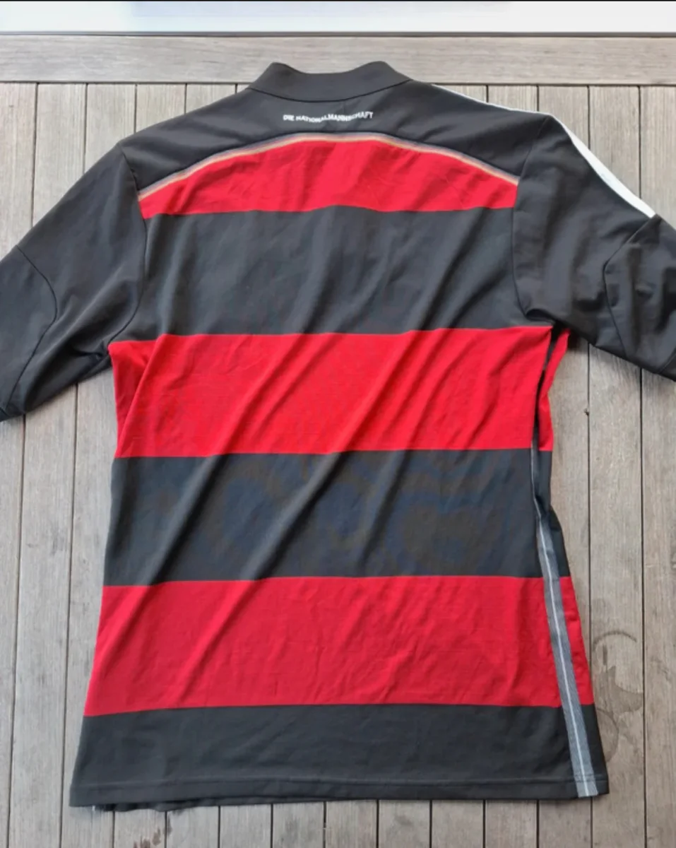Camiseta de la segunda equipación de alemania en talla S de la selección alemana de fútbol, con gran descuento por un pequeño agujero en la parte izquierda frontal de la camiseta apreciable en las fotos. En la temporada en la que los alemanes ganaron con rotundidad el mundial del 2014 celebrado en Brasil. Con esta camiseta, el combinado germano le endosó un 1-7 histórico a la selección Brasileña. Camiseta con señales normales de uso de una prenda vintage como se aprecia en las fotos
