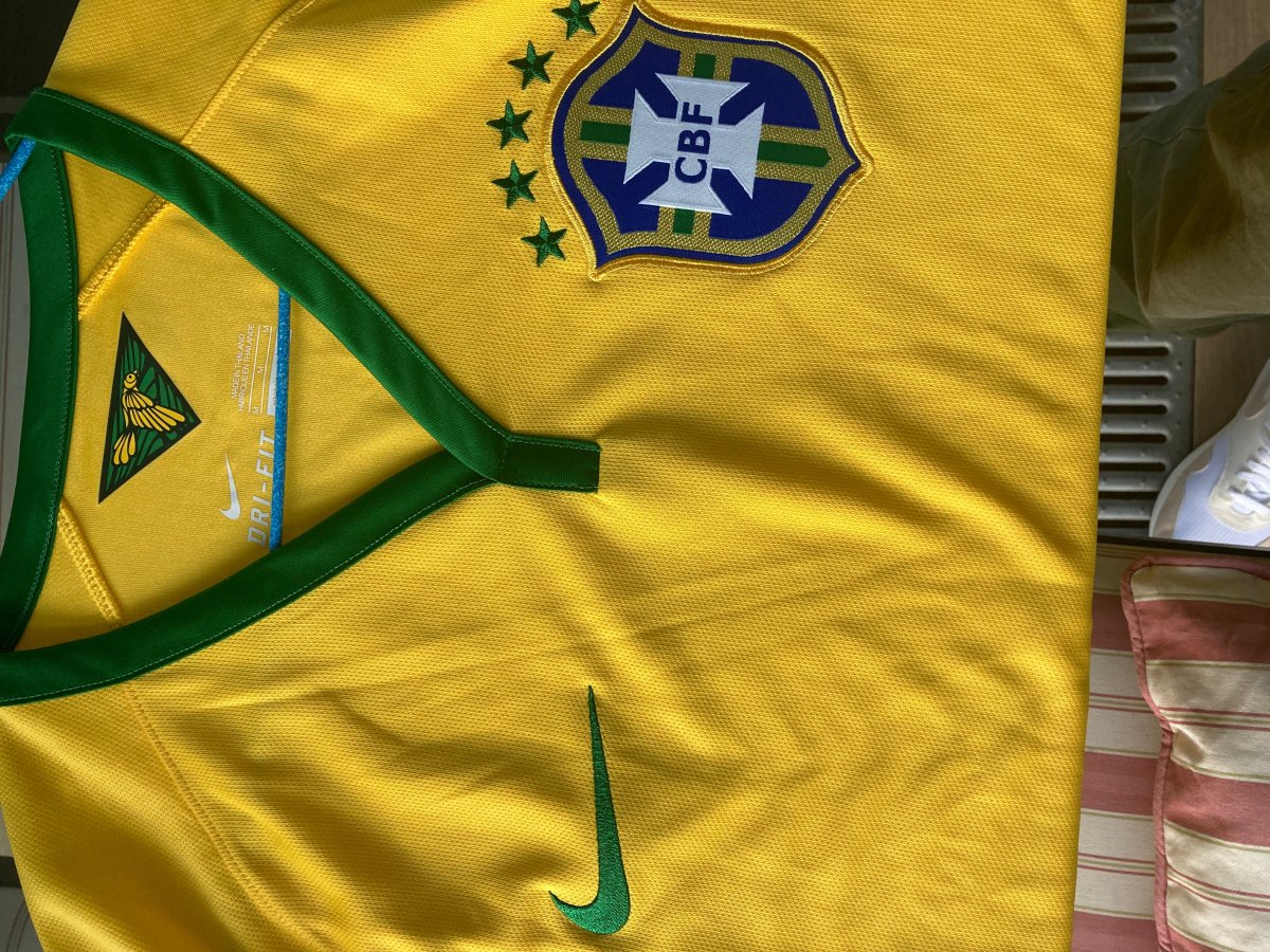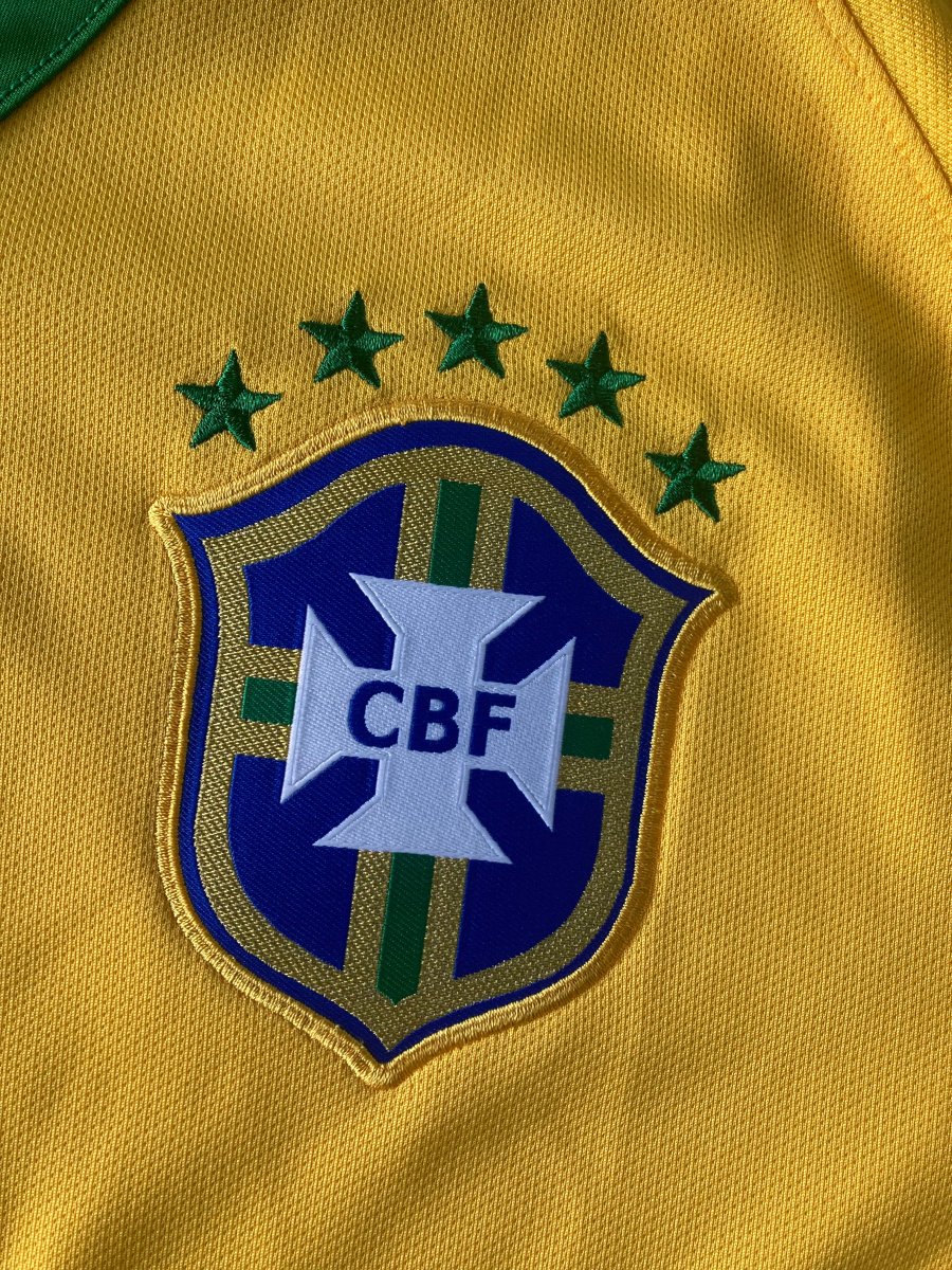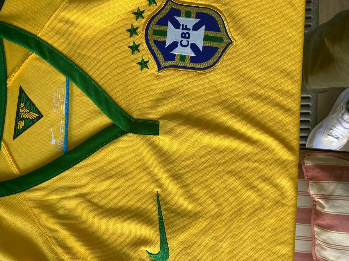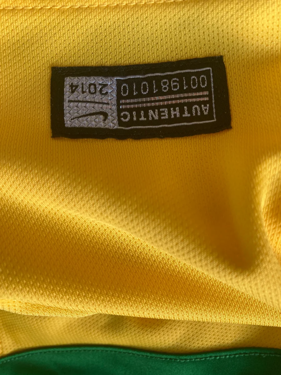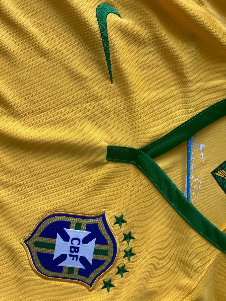 Camiseta Nike de la primera equipación de la selección brasileña de fútbol en talla M, nueva a estrenar con etiquetas, con la que la canarinha disputó el mundial del 2014, celebrado en su país.Brasil llegaba con la ilusión de ser anfitrión del torneo, y todo parecía preparado para que la Pentacampeona pudiese celebrar otro título mundial en su país, con un Neymar liderando a los brasileños en el campo, pero una dura entrada en la espalda por parte de Camilo Zuñiga en los cuartos de final del torneo dejó a Neymar fuera de la competición y con una vertebra fracturada. En las semifinales frente a Alemania, Brasil recibió una goleada histórica, al caer por 1 a 7, con su estrella Neymar ya fuera de escena