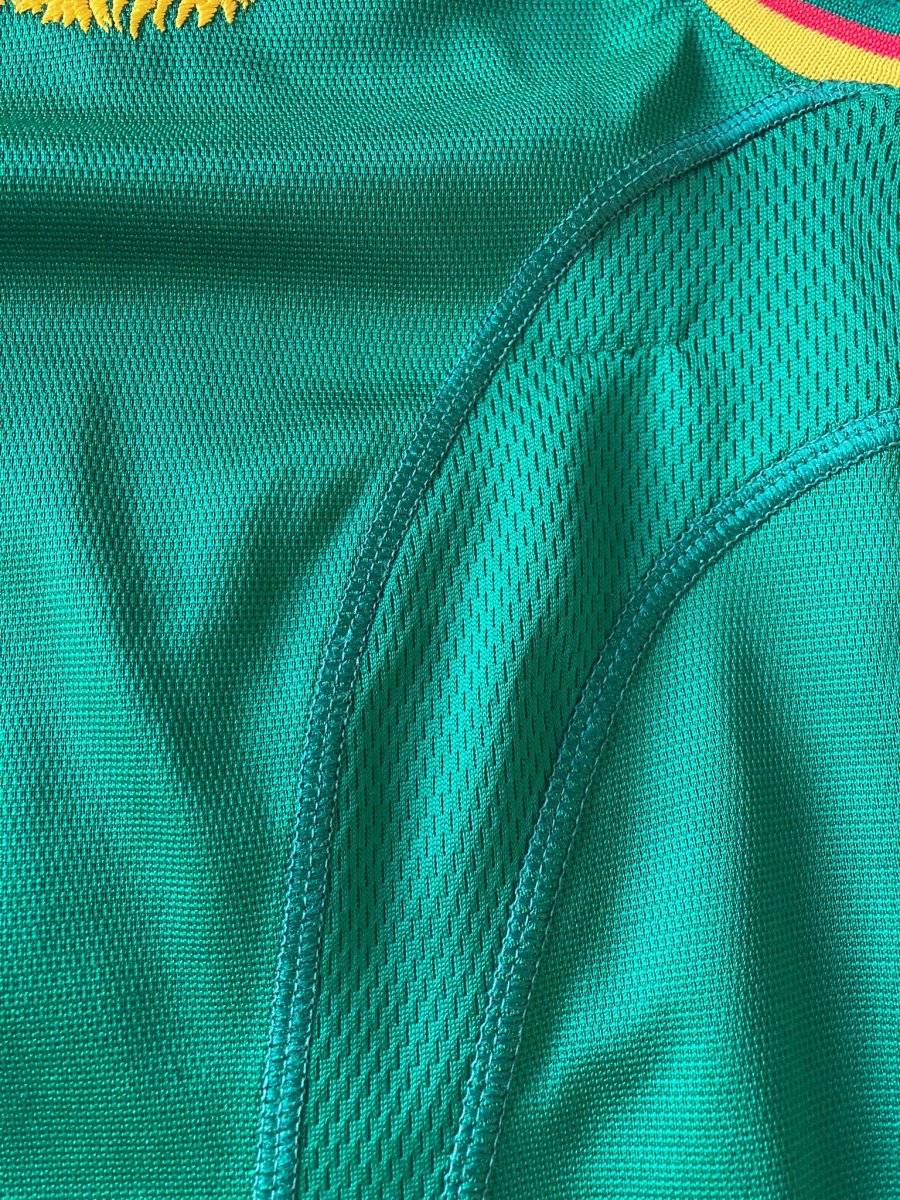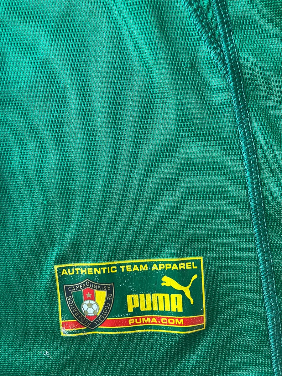 Camiseta Puma de la selección de Camerún de la temporada 2002, en un espectacular e innovador diseño sin mangas que fue utilizado por los leones indomables durante la clasificación del mundial de Korea y Japón y que Camerún pretendía usar en el mundial, pero que Fifa, prohibió y Puma tuvo que improvisar unas mangas negras para ese torneo. Grandes jugadores como Samuel Eto’o, Patrick M’Boma o Lauren lucieron esta camiseta con la selección de Camerún. Camiseta en talla y buen estado con pequeños signos de uso normales de una prenda vintage, visibles en las fotos