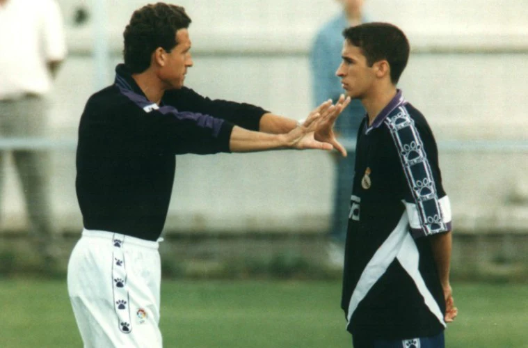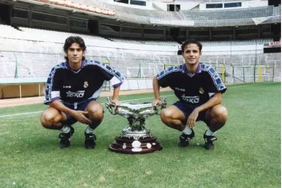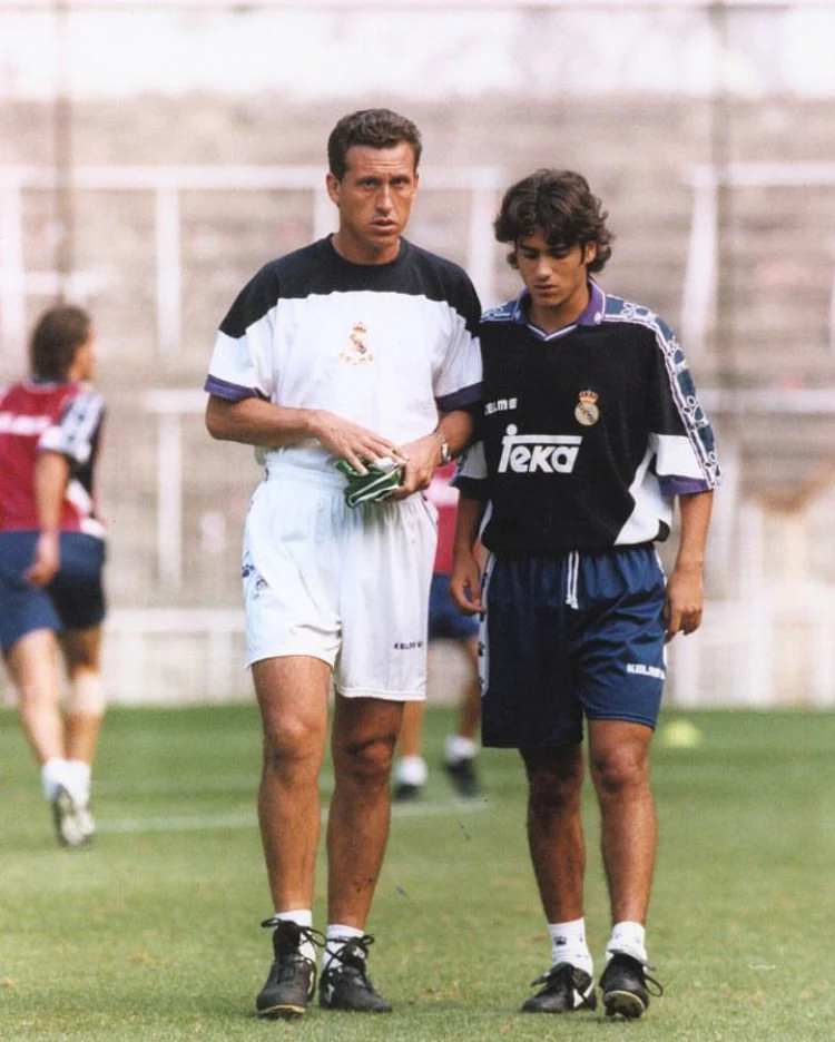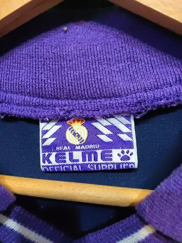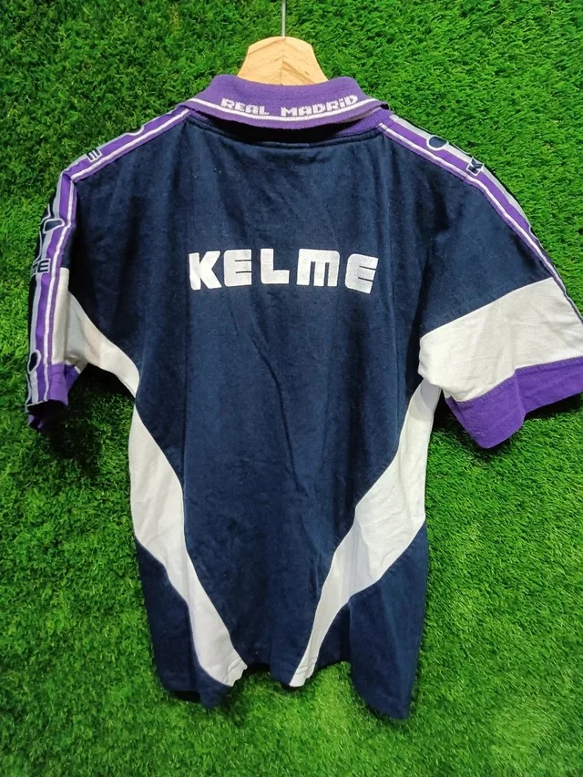 Camiseta Kelme de la equipación de entrenamiento del Real Madrid en la temporada 1994-95, temporada en la que bajo las ordenes del argentino Jorge Valdano debutaron jugadores como Raúl González, Guti Hernández, Álvaro Benito o Sandro. La camiseta presenta signos de desgaste por el paso del tiempo, propios de una prenda vintage, en la parte trasera de la camiseta visibles de cerca.