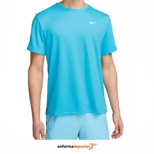 Camiseta hombre NIKE DRI-FIT UV MILER, de corte estándar, cuello redondo y manga corta, confeccionada en tejido 100% poliéster con tecnología DRI-FIT para mantener la transpirabilidad, comodidad, de tacto suave reduce el roce durante las carreras, con costuras de los hombros están desplazadas hacia atrás para que los brazos se muevan libremente, dobladillo curvo amplía la protección en la parte posterior, al tiempo que sus aberturas favorecen la libertad de movimiento y elementos reflectantes.