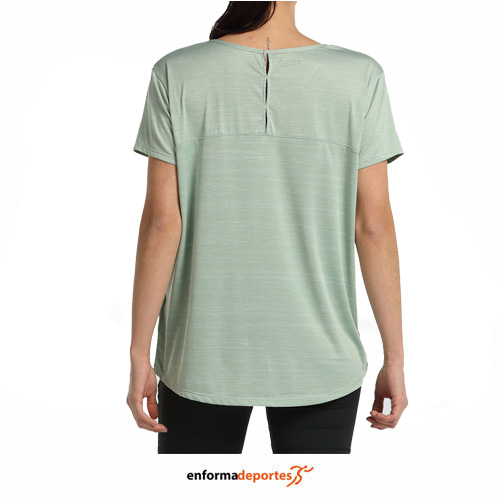 Camiseta mujer +8000 ACACIA, fitting suelto, confeccionada en tejido de 100% polyester rayado, con apertura decorativa en la espalda, logo impreso en el pecho, con acabado Drynamic, tejido con microfilamentos de poliéster, que ayudan a evaporar la humedad.