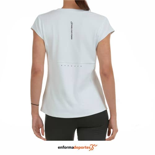 Camiseta mujer BULLPADEL PORTAS, de corte estandar, confeccionado con un tejido en punto de poliéster elástico, que incorpora inserciones de tejido Waffle en la espalda y pecho, tejido técnico que cuenta con la tecnología Drylum, lo que lo hace hidrófobo y transpirable, con perforaciones láser que facilitan la ventilación.