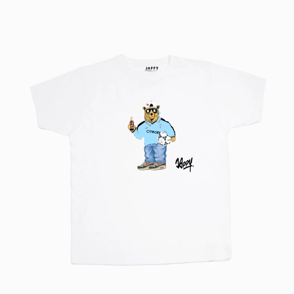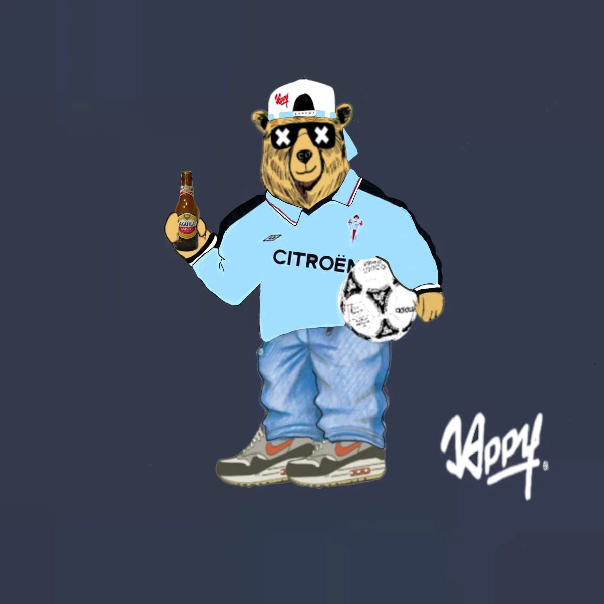 Esta camiseta Oso Euro Celta es un homenaje directo a aquella era irrepetible. Nuestro icónico oso Jappy viste el mítico celeste, balón Etrusco bajo el brazo —símbolo universal del fútbol noventero— y una cerveza en la mano, como se vivía el fútbol entonces: grada, calle y sentimiento celeste.