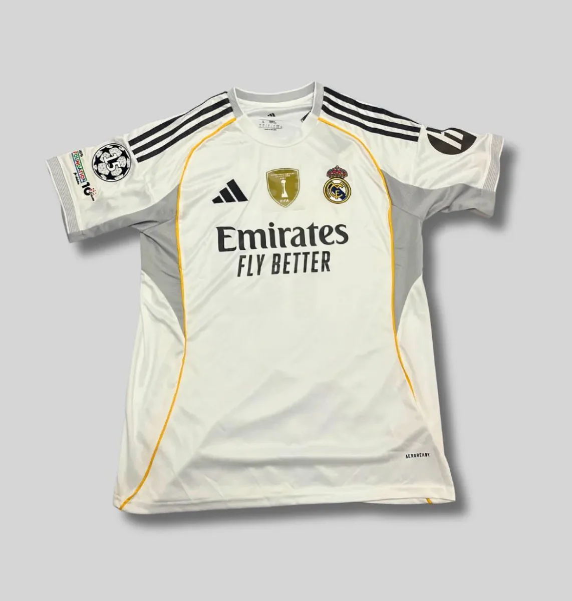 Los detalles del diseño incluyen elementos distintivos del Real Madrid, como el escudo en relieve, el acabado premium en las mangas y la incorporación de líneas estilizadas que aportan un toque elegante y vanguardista. Cada aspecto ha sido cuidadosamente creado para reflejar como es debido la grandeza y la identidad del club.