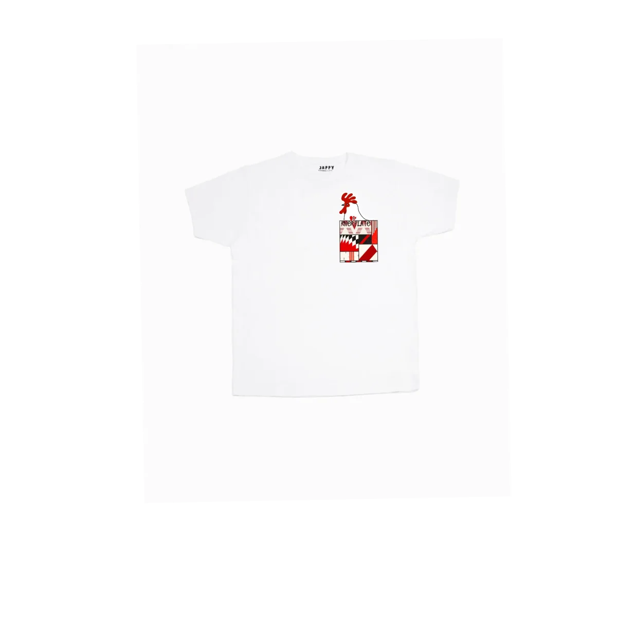Camiseta blanca 100% algodón de diseño exclusivo de Jappy Football Clothing en homenaje al querido Club Atletico River Plate, sus jugadores, su hinchada, sus kits, su estadio el monumental, dn definitiva un tributo gráfico a la historia, los colores y las camisetas icónicas de River Plate, con un toque irreverente y auténtico: el gallo que representa con orgullo a su afición, las gallinas.