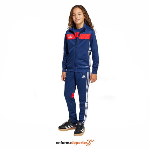 Chandal junior ADIDAS TIRO ES TS, confeccionado en poliéster reciclado con tecnología AEROREADY, diseñada para mantener la piel seca durante la actividad deportiva, de corte regular ofrece comodidad en cada movimiento, con chaqueta con práctica cremallera, mientras que los pantalones cuentan con una cintura elástica para un ajuste perfecto.