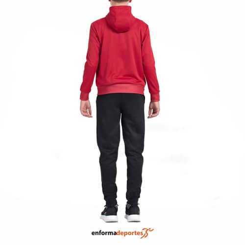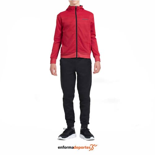 Chandal junior JOHN SMITH CHAO, confeccionado en tejido 100% poliéster interlock con interior perchado, con capucha para mayor protección y confort. Compuesto de dos piezas, parte de arriba chaqueta con prácticos bolsillos con cremallera y el logo, con cierre con cremallera completo. Parte inferior, pantalón con cinturilla ajustable, bolsillos funcionales y puños de canalé que garantizan un ajuste perfecto y comodidad durante todo el día.