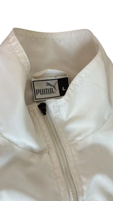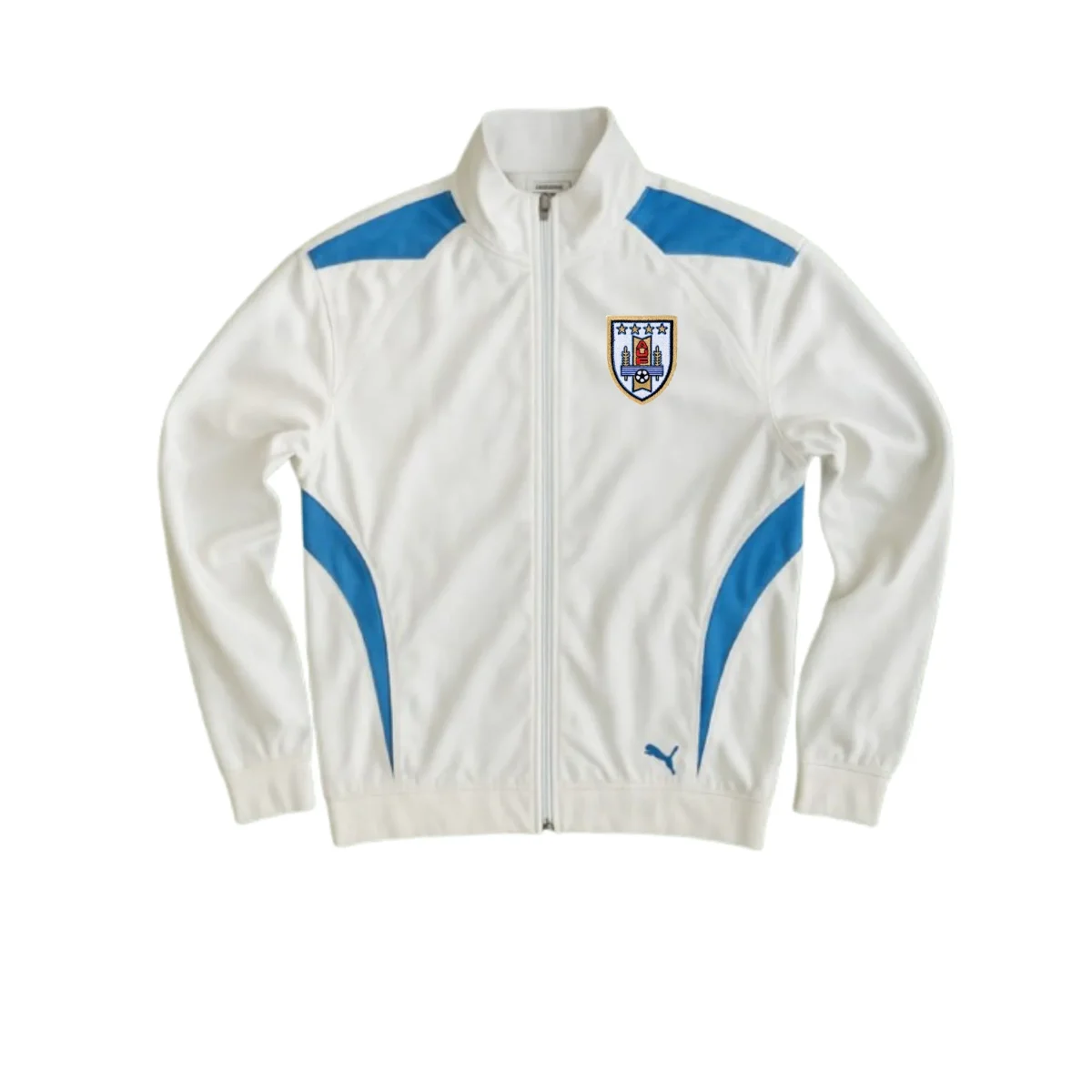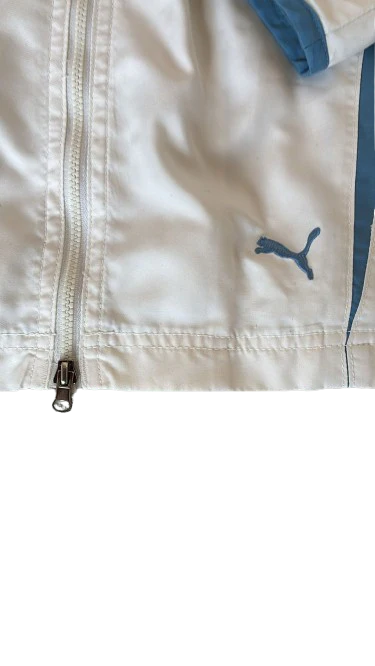 Diseñada en blanco con inserciones celestes y el clásico escudo bordado de la AUF en el pecho, esta pieza es un icono de la era Puma, reconocida por su sencillez y elegancia. Confeccionada en poliéster ligero y transpirable, cuenta con cierre de cremallera completo y bolsillos laterales.