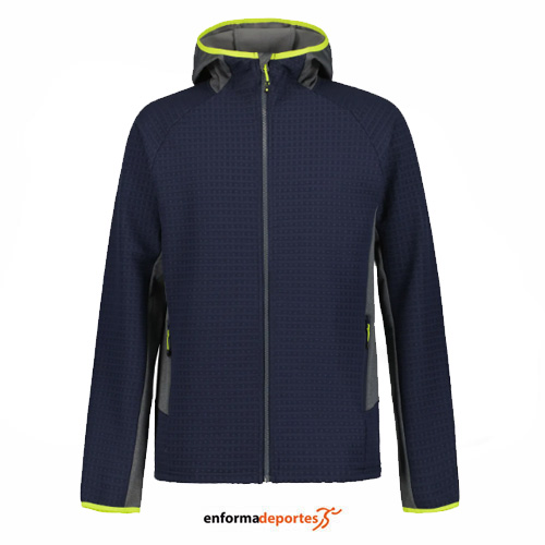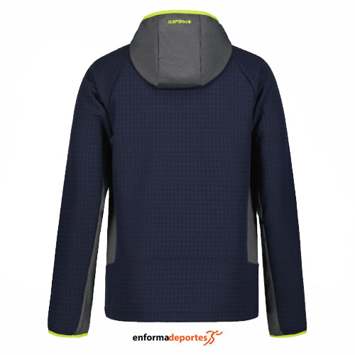 Chaqueta hombre ICEPEAK BURDETT, confeccionada en tejido poliéster y elastano, capa intermedia de ajuste regular, con mangas raglán, cierre completo con cremallera, con elástico alrededor de la abertura de la cara, puños elásticos, con 2 bolsillos delanteros con cremallera, con tratamiento repelente al agua sin PFC.
