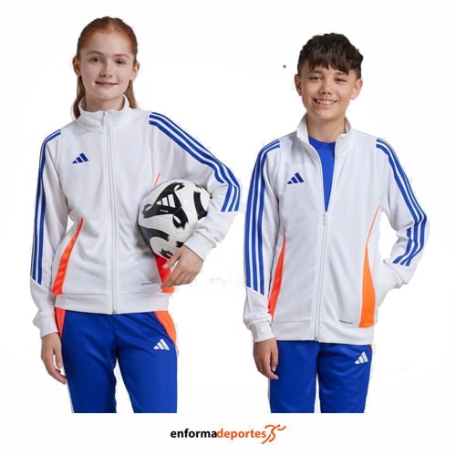 Chaqueta junior ADIDAS TIRO24, de corte entallado, confeccionada en tejido punto doble 100% poliéster reciclado, con tecnología Aeroready, con cierre de cremallera y cuello alzado, con bolsillos frontales con cremallera y puños y dobladillo de canalé.