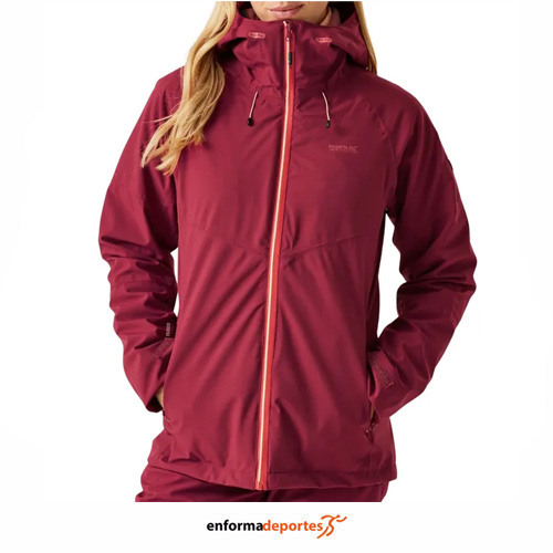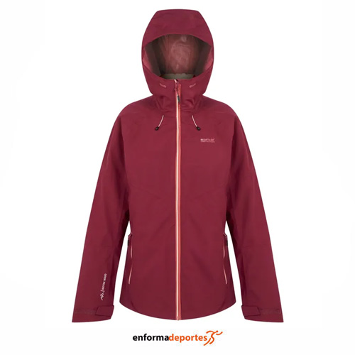 Chaqueta mujer REGATTA WENTWOOD IX, confeccionada en tejido elástico 100% poliéster reciclado Isotex 15000 impermeable y transpirable, con índice de transpirabilidad 15.000 g/m²/24 horas, con acabado repelente al agua duradero, costuras selladas, con capucha técnica con ajuste bidireccional y visera reforzada para un mejor ajuste y protección, cremallera central delantera con canal de drenaje, 1 bolsillo con cremallera en el pecho y 2 bolsillos inferiores con cremallera, con mangas articuladas para un mayor rango de movimiento, con bolsillo interior de seguridad con cremallera, puños ajustables, dobladillo ajustable con cordón elástico, 2 bolsillos inferiores con cremallera y costuras elásticas en cuello, puños y dobladillo.