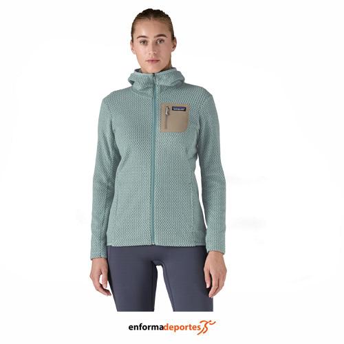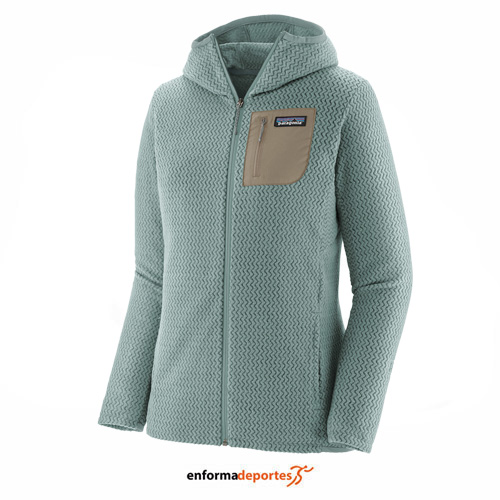 Forro polar mujer PATAGONIA R1 AIR, confeccionada en tejido vellón jacquard de poliéster 100 % reciclado con hilos de núcleo hueco presenta una textura en zigzag única que absorbe la humedad, se seca rápido y es altamente transpirable para actividades de alto rendimiento, con costuras fuera de los hombros se asientan cómodamente debajo de las correas de la mochila, con bolsillo en el pecho izquierdo para guardar fácilmente artículos pequeños,  dos bolsillos delanteros con cremalleras mínimas para reducir el volumen, ligero y comprimible, con tejido de secado rápido en el dobladillo trasero y los puños para mayor elasticidad y mejor ajuste, con cremallera frontal completa para una fácil ventilación y una capucha ajustada para usar debajo de cascos y capuchas.