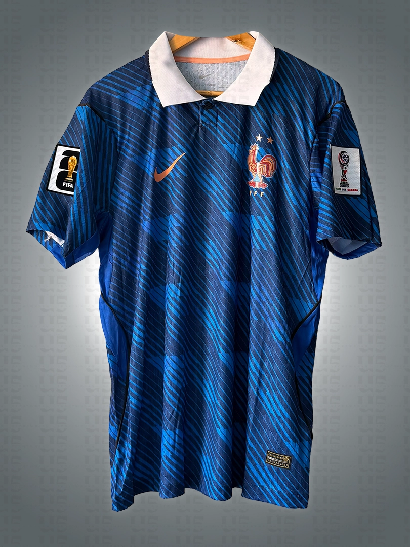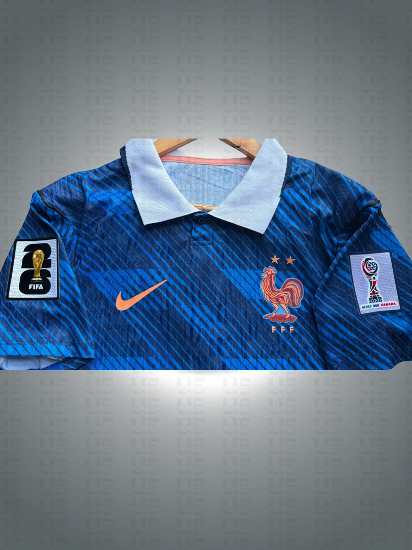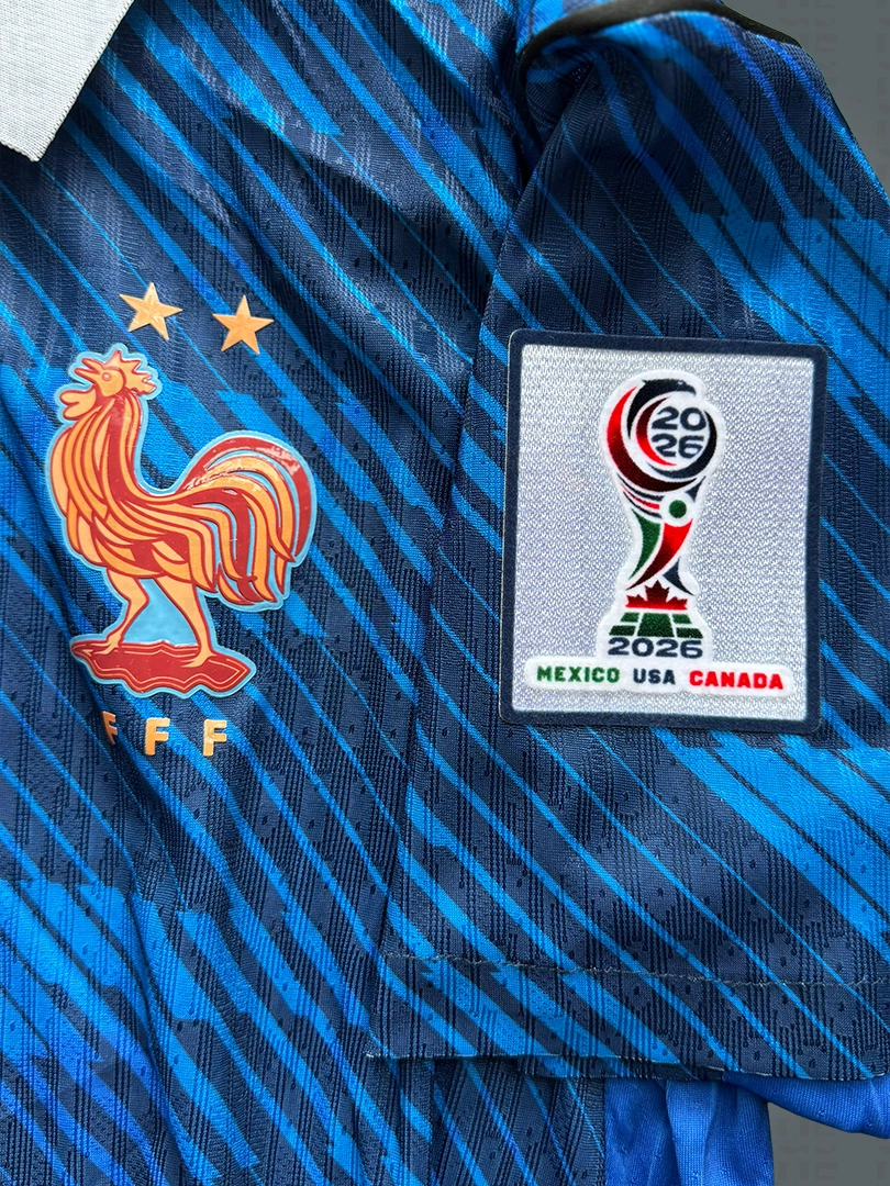 Camiseta Francia Mundial Local 2026 1.1 tipo jugador, ideal para entrenamiento y partido. Disponible en tallas S–XXL. Si quieres el nombre y número, selecciona la opción de personalización.