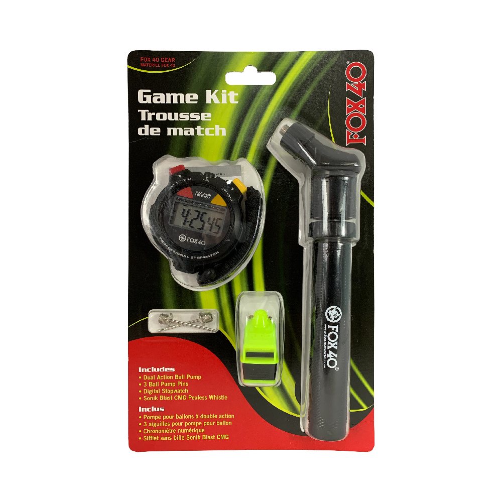 El kit Fox 40 incluye: inflador de bomba de doble acción, 3 agujas para inflar balones, cronómetro digital y silbato