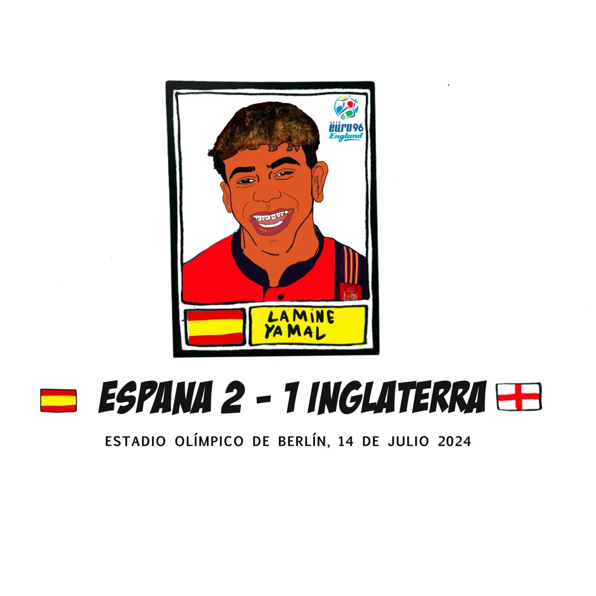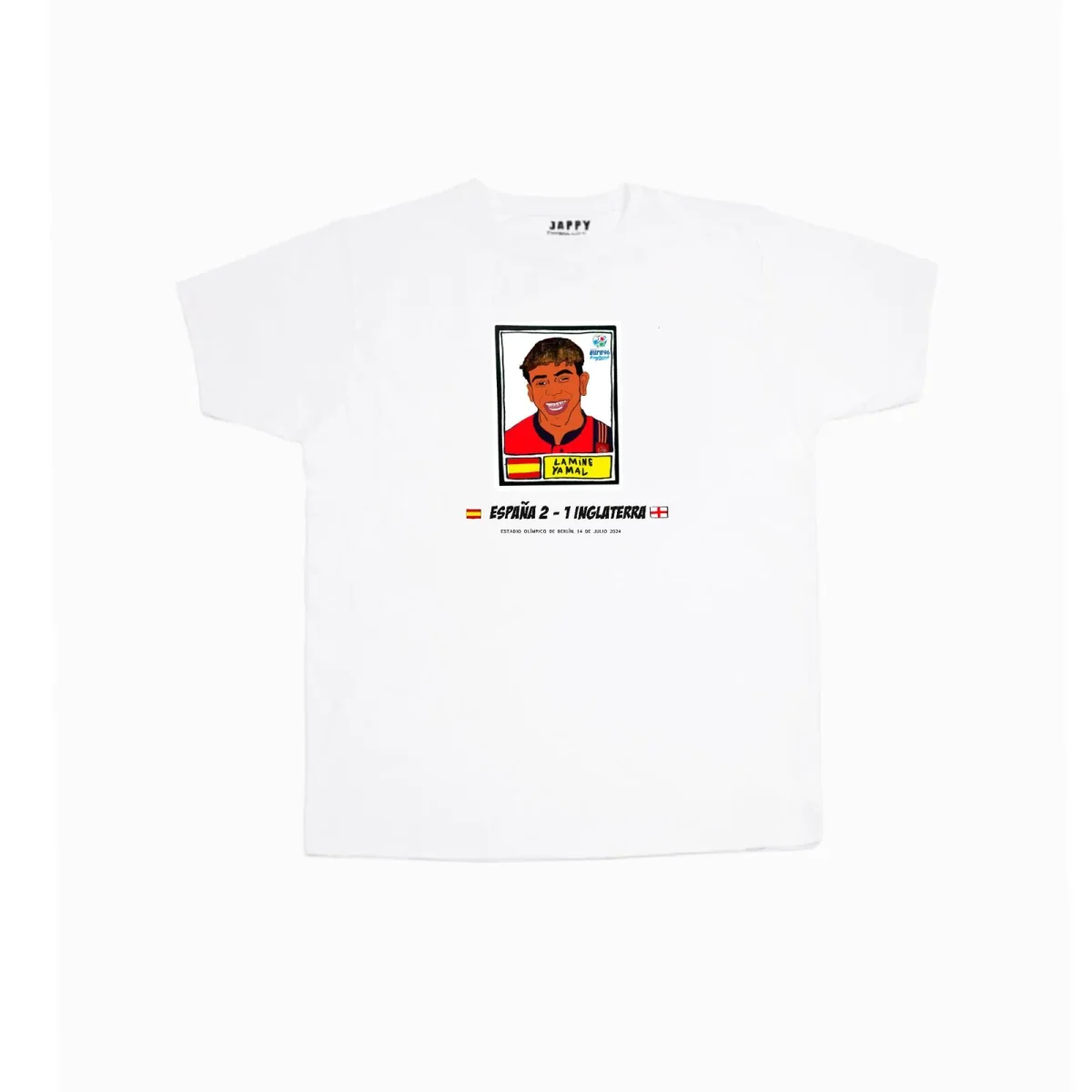 Camiseta de algodón 100% con diseño exclusivo de Jappy football clothing en homenaje a la victoria de la selección española de fútbol. España se coronó campeona de la Eurocopa, con varias figuras brillando en el equipo, entre ellas, lamine Yamal, coronado como mejor jugador joven del torneo, que brilló e impacto al mundo con su juego. Esta victoria, representa la venganza del combinado español frente a la selección inglesa, que eliminó a la roja en la Eurocopa de 1996, con un arbitraje controvertido y tras una fatídica tanta de penaltis, en la que tanto Fernando Hierro como Miguel Angel Nadal fallaron su lanzamiento.