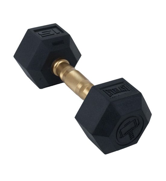 Mancuernas hexagonales de hierro con mango cromado y cabezas recubiertas en caucho.