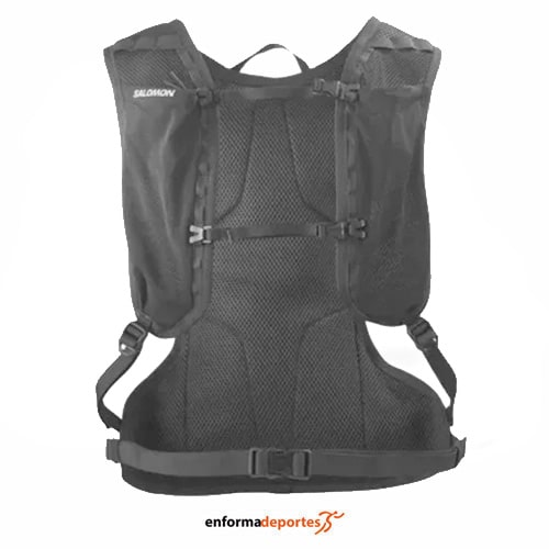 Mochila SALOMON 8 CROSS, confeccionada en tejido poliéster, con capacidad para 8 litros, con inserto trasero acolchado, compatible con depósitos de 1,5 litros y con soft flasks de 500ml, con correas de esternón dobles ajustables, con sistema de fijación de botella y de depósito con salida del tubo del depósito compatible con todas las botellas de la marca Salomon, con 2 bolsillos delanteros, las trabillas elásticas en la parte superior del bolsillo bloquean la botella, con amplia apertura en forma de U con cremallera, con sistema de transporte para lámpara, con un asa superior. Dimensiones: ancho 210mm x alto 440mm x profundo 10mm.