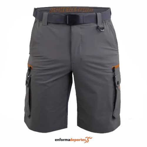 Pantalón corto hombre SPHERE ZENON, confeccionado en tejido tratado con DWR repelente al agua, secado rápido y bielástico, con cintura semi elástica con cierre de botón corchete, cinturón elástico ajustable, ocho bolsillos (cuatro con cremalleras invertidas a contraste, los delanteros tipo francés y dos laterales tipo cargo con cierre de botón a presión), logo bordado.