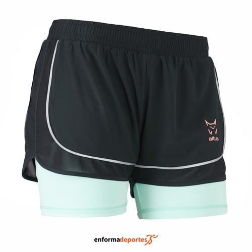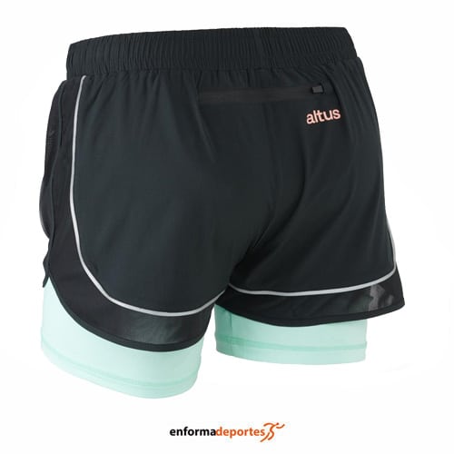 Pantalón corto mujer ALTUS LEN, ideal para la práctica de deportes como el running y Trail running, ligero, resistente, que aporta comodidad y libertad de movimientos, con malla interior que evita los roces, confeccionado en tejido poliéster, pantalón compuesto por dos piezas unidas: pantalón + malla, con bolsillo trasero con cremallera porta material, con mallas laterales para favorecer la ventilación y elasticidad, con cintura con ajuste personalizado gracias a cordón interior y ribeteado reflectante para aumentar la visibilidad nocturna.
