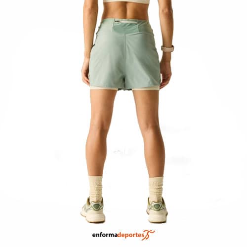 Pantalones cortos mujer DARE2B NIMBLE, confeccionados en tejido exterior ligero poliéster, que se combina con un pantalón corto interior elástico en 4 direcciones para una comodidad máxima, con bolsillo trasero cerrado con cremallera, con detalles reflectante, con cintura alta elástica, con tratamiento antibacteriano para el control de olores sin químicos sintéticos.