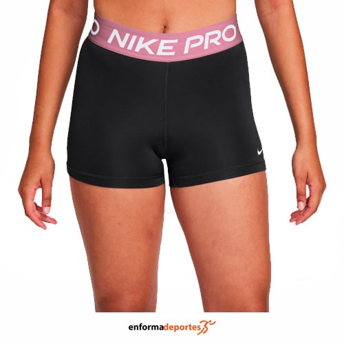 Malla corta mujer NIKE PRO 3″, de corte ajustado, confeccionada con tejido con tecnología Nike Dri-FIT mantiene la transpirabilidad, la comodidad y la concentración, con pretina ancha y elástica de tiro medio brinda soporte alrededor del torso.