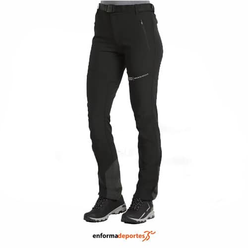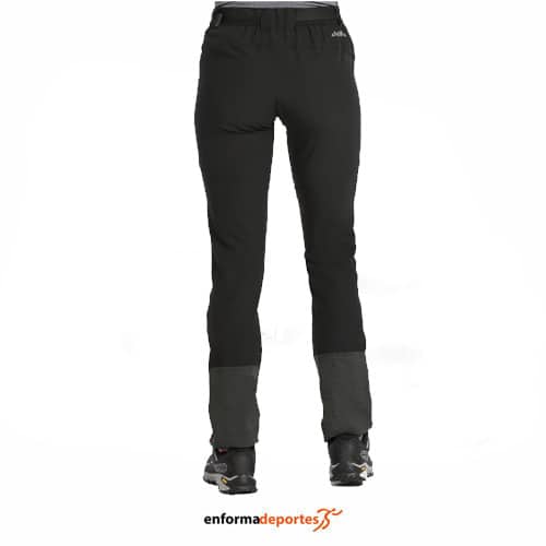 Pantalón mujer +8000 VALREAS, ideal para la práctica de trekking de corte ajustado, confeccionado en tejido biélástico calidad Shellflex, con bolsillos superiores y bolsillo lateral con cremallera, rodillas preformadas, con cintura elástica con cinturón personalizado, bajos semi-elásticos con cremalleras laterales .