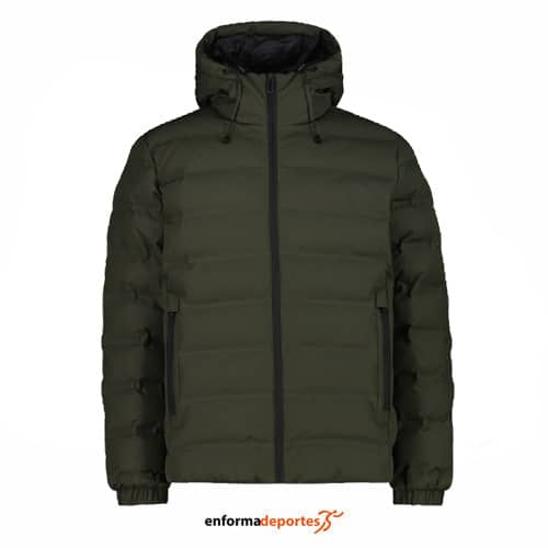 Plumas hombre CAMPAGNOLO FIX HOOD, acolchada con capucha ajustable, acolchado Feel Warm Flock, fabricado con fibras sintéticas flocadas, garantiza un excelente aislamiento térmico, además de transpirabilidad, impermeabilidad y ligereza, con membrana Clima Protect y tratamiento impermeable (10.000 WP/MVP 10.000) y con dos bolsillos frontales.