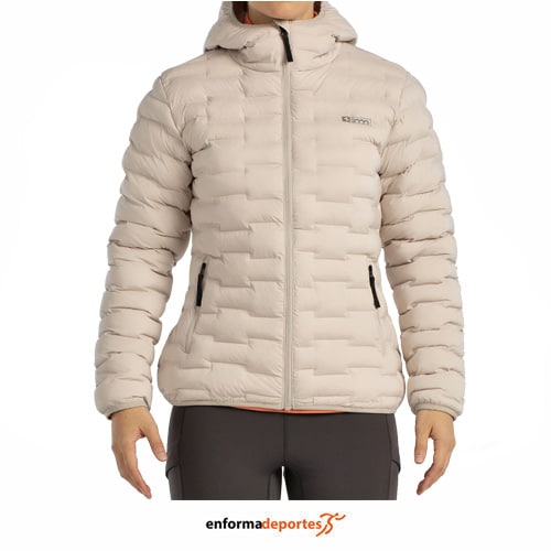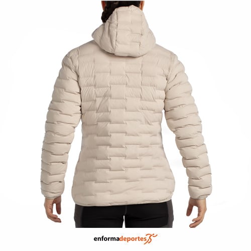 Plumas mujer +8000 SANDEI, confeccionada con un tejido 3D bi-elástico de alta prestación,  sin costuras, crea cámaras que albergan el aislante, proporcionando un ajuste cómodo y libertad total de movimiento, con acabado DWR libre de PFC refuerza la repelencia al agua, con relleno Sorona Aura de DUPONT ofrece un aislamiento térmico superior, ligereza y resistencia al agua, con cremalleras en los bolsillos laterales y un tercer bolsillo en el pecho con cremallera invisible, además de bajo ajustable con tankas y capucha y puños rematados con vivos elásticos.