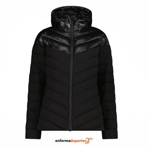 Plumas mujer CAMPAGNOLO SNAPS HOOD, de plumón, con capucha fija y cierre completa con cremallera, confeccionada con tratamiento repelente al agua, ofrece protección eficaz contra el viento y la lluvia, con dos bolsillos laterales, acolchado con tecnología Sorona® Aura, prenda ligera, funcional y sostenible.
