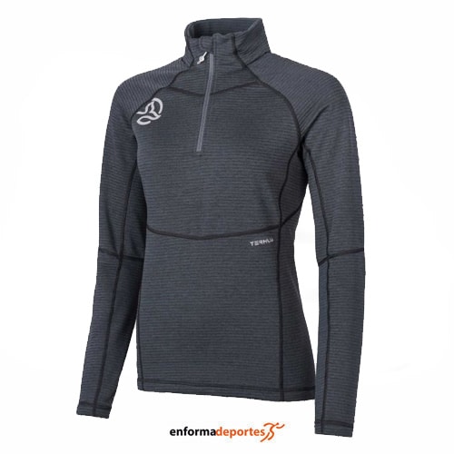 Pullover mujer TERNUA MOMHILL, segunda capa, confeccionada en tejido DRYSHELL micro-polar, fino y ligero pero cálido, transpirable y de secado rápido, muy resistente y con buena resistencia al pilling, proporciona una excelente libertad de moviminentos, con cremalleras YKK FLAT VSILON, protector de barbilla, bajos acabados con ribete elástico y con acabado con tratamiento de repelencia al agua (DWR) libre de PFC’s.