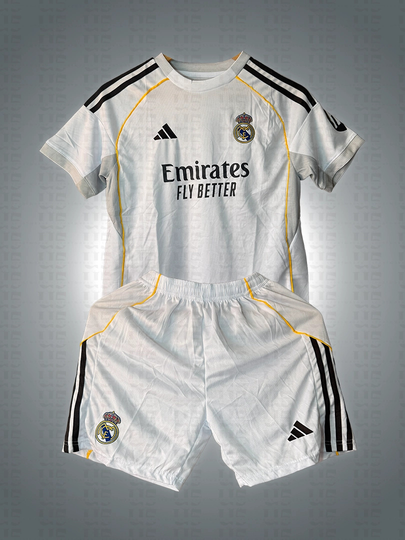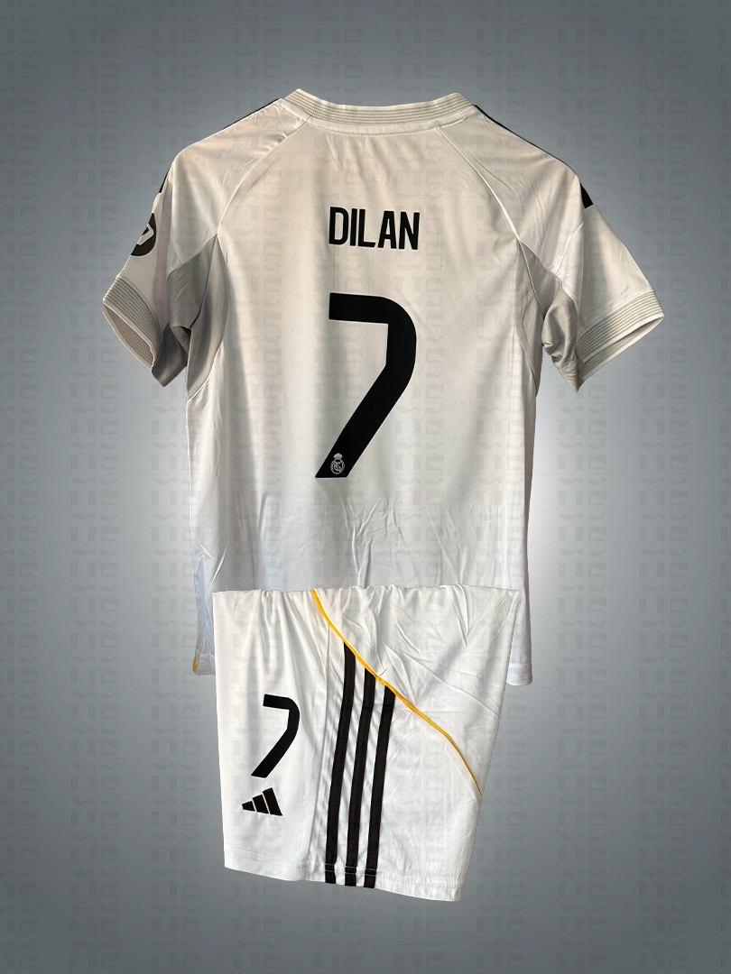 Uniforme Real Madrid Niño ideal para entrenamiento ideal para partido. Disponible en tallas 8–16. Si quieres el nombre y número, selecciona la opción de personalización.