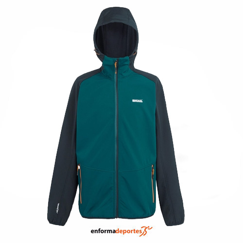 Softshell hombre REGATTA AREC III, confeccionada con tejido elástico repelente al agua y resistente al viento, con bolsillos con cremallera y capucha.