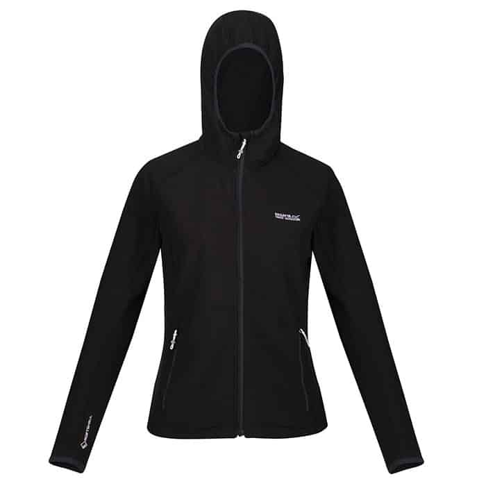 Softshell mujer REGATTA AREC III, confeccionada en poliéster y elastano, con acabado repelente al agua, con bolsillos laterales con cremallera y capucha.