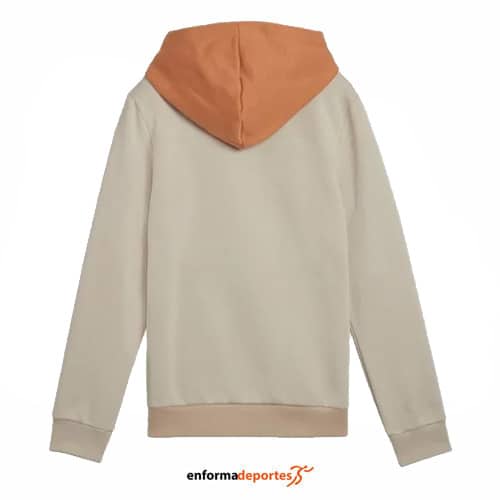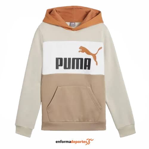Sudadera junior PUMA ESS BLOCK HOODIE FL DESERT DUST, confeccionada en tejido algodón y poliéster, de corte holgado, con capucha fija, tejido suave, con bolsillo tipo canguro y ribetes acanalados en puños y dobladillo.