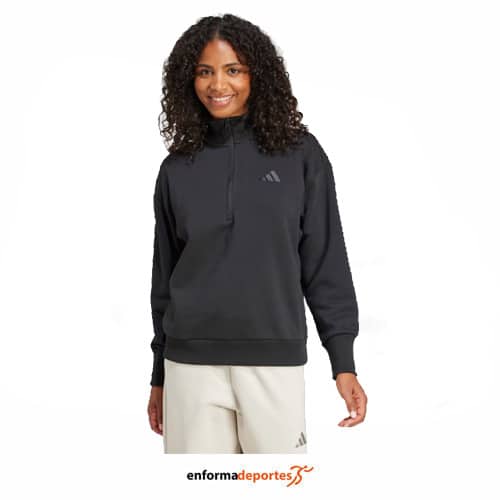 Sudadera mujer ADIDAS ALL SZN QZ, de corte holgado, confeccionada en tejido algofón y poliéster, con media cremallera con cuello alto acanalado, inserciones acanaladas en las axilas, puños y dobladillo acanalados y detalles bordados