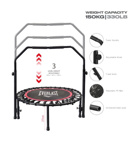 El trampolín está diseñado para un fácil manejo y un rebote seguro. El mango de material de espuma facilita el agarre y evita que usted salte del trampolín. La altura del mango se puede ajustar en 3 niveles diferentes (38″ / 42″ / 46″), lo que puede satisfacer las demandas de todos. El pasamanos está envuelto en espuma de alta densidad para un agarre cómodo y mayor estabilidad y seguridad.
