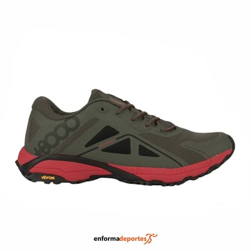 Zapatilla hombre +8000 TERUX, zapatilla ideal todoterreno perfecta para trailrunning o senderismo, confeccionada en su parte superior de malla transpirable y refuerzos sintéticos termosellados para evitar costuras innecesarias, con tecnología Skintex que proporciona protección ligera para la lluvia, entresuela de phylon que amortigua la pisada, con lengüeta acolchada, tipo fuelle que evita la entrada de suciedad, con cuello del tobillo acolchado, muy cómodo y suela Vibram XS TRECK muy duradera.